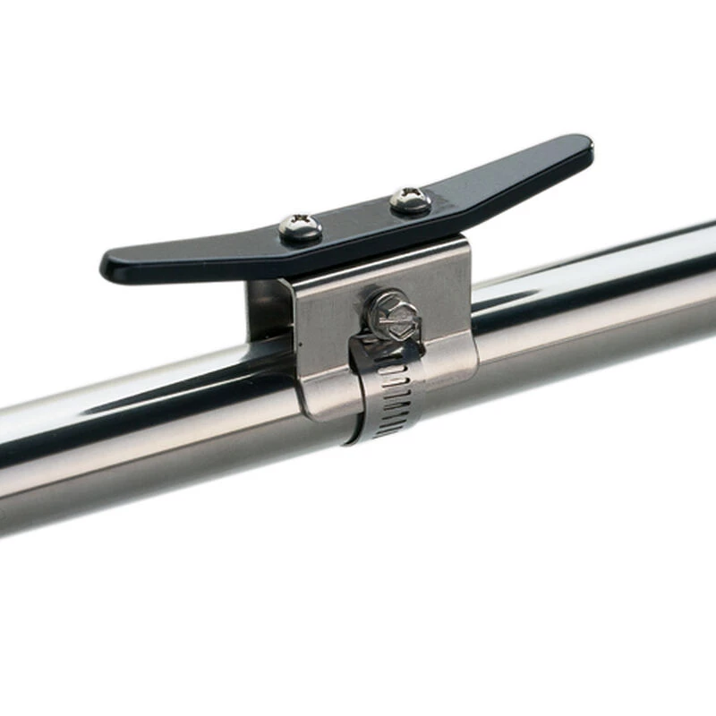 4-1/2″ nylon-coated anodized aluminum cleat mounts easily on7/8″ or 1″ rails. Stainless bracket and clamp.