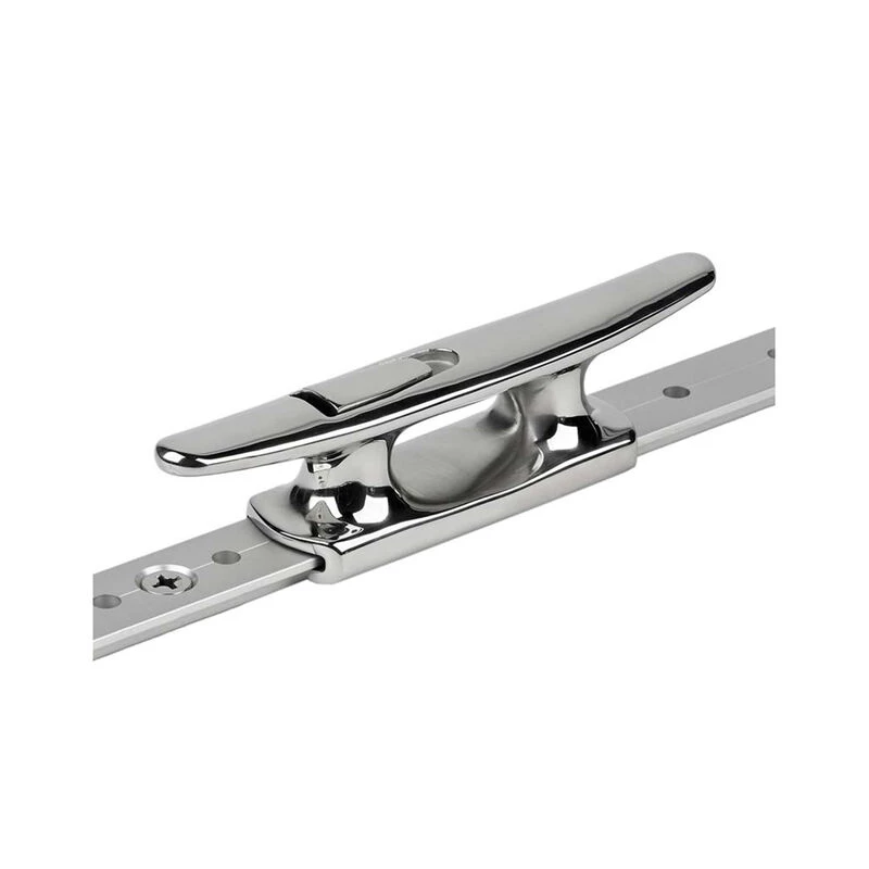 Reduce deck clutter, tie spring lines, fenders, dinghies, etc. ontothis moveable, low-profile, heavy-duty cleat. The spring-loadedcleat fits on 1″ and 1-1/4″ T-track, so you can make quick andeasy position changes without tools. Made of corrosion-resistant, polished, investment cast 316stainless, this strong, adjustable cleat can also be used as a chock. To install, simply remove trackend stop, slide on the cleat and lock into desired position. Short track lengths can be installed forusing the cleat in other locations aboard.