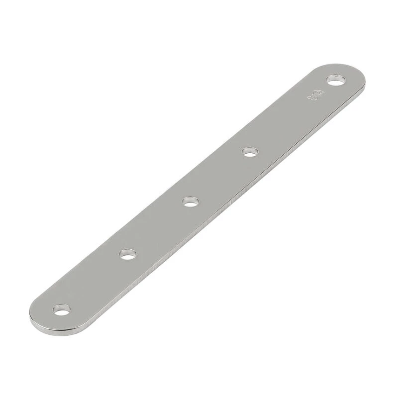 1″ and 1-1/4″ sizes are flat with four fastener holes. 1-1/2″ size is formed (bent) with five fastener holes. High-quality stainless steel. Thickness: 1/8″.